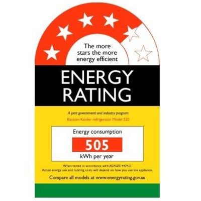 澳大利亚能源定额标签(The Energy Rating label)是一种比较标识,标签图形(如下图所示)包含一个矩形底座和底座顶部的一个半圆,这个半圆呈“表盘”状图形,标识星级定额。表盘半圆标有六星,沿着刻度盘的顺时针方向排列,星级越多,表明能效越高,运行成本越低。底座中间用数字标识该电器“正常”服务条件下的年(或每小时)评估的耗电量(洗衣机用水量),即CEC。